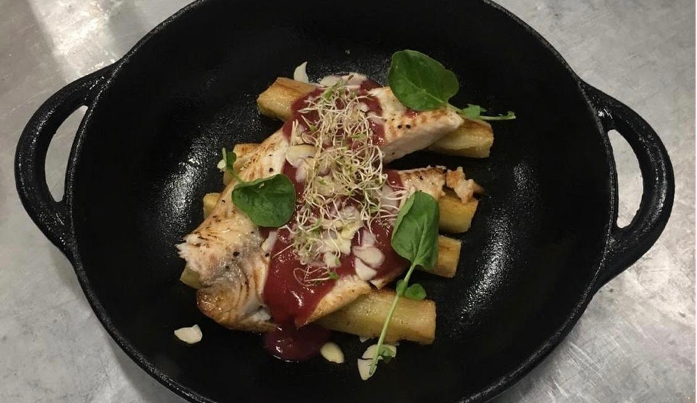 • Serve the fish by topping it with the roasted yucca and delicious berry sauce. Garnish with a few edible flowers and leaves!
